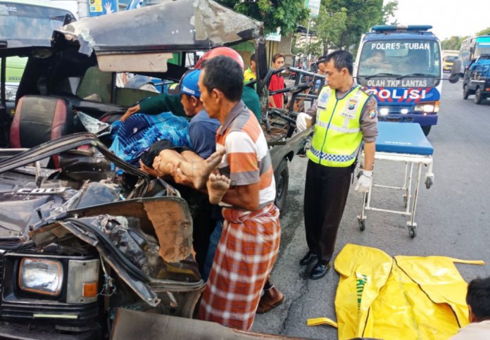 kabartuban.com – Sebuah kendaraan truk trailer seruduk mobil Pick Up L300 di jalan Tuban – Widang Km 29-30 tepatnya Desa /Kecamatan Widang. Dari peristiwa tersebut satu orang penumpang Pick Up tewas di lokasi kejadian atau tempat kejadian perkara (TKP) dan tiga orang mengalami luka-luka dirawat di rumah sakit Muhammadiyah Babat-Lamongan, Rabu (23/5/2018) pagi sekitar pukul 05.0 WIB.