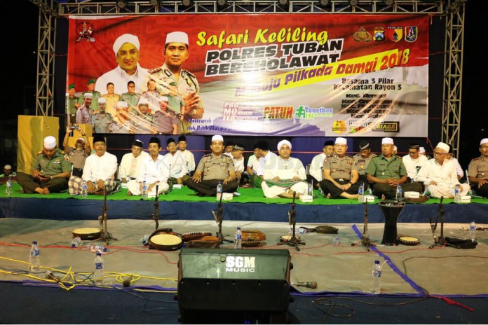 kabartuban.com – Bersholawat menjadi jurus Kapolres Tuban AKBP Sutrisno HR mengajak masyarakat untuk menyejukan hati, sekalugus menjaga Kabupaten Tuban tetap adem, menjelang pesta demokrasi pemilihan Gubernur dan wakil Gubernur Jawa Timur 2018.