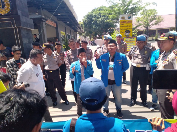 kabartuban.com – Belasan Mahasiswa yang mengatasnamakan diri Pergerakan Mahasiswa Islam Indonesia (PMII) Cabang Tuban, menggelar aksi di depan Mapolres Tuban, Senin (18/11/2019).