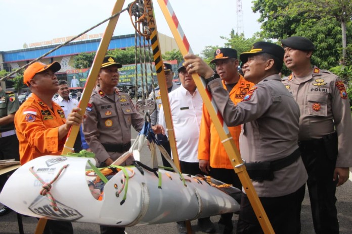 Usai apel, kegiatan dilanjutkan dengan pemeriksaan sarana prasarana tanggap darurat, meliputi perahu karet, alat evakuasi, kendaraan operasional, dan perlengkapan medis.