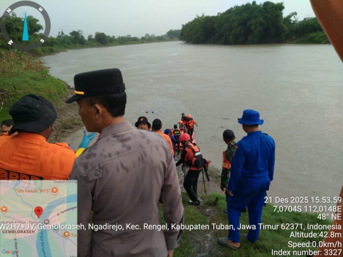 kabartuban.com – Pencarian terhadap korban tenggelam di Sungai Bengawan Solo akhirnya membuahkan hasil. Agus Winarto (38), warga Dusun Purboyo Mayang Sekar, Desa Rengel, Kecamatan Rengel, Kabupaten Tuban, ditemukan dalam kondisi meninggal dunia pada Minggu (21/12/2025) sore.
