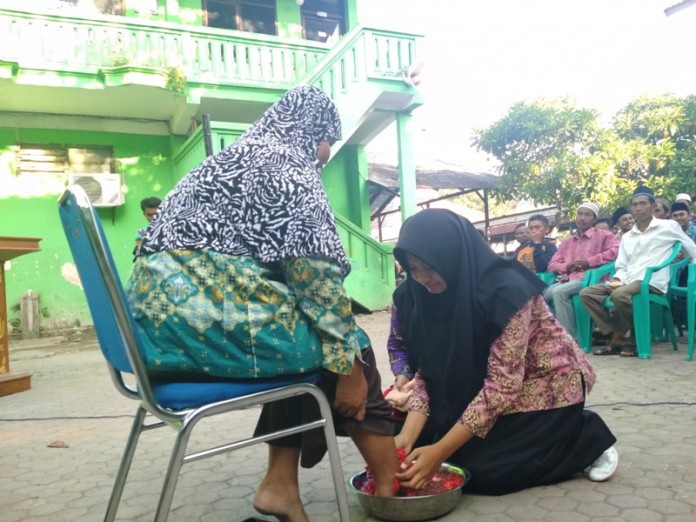 “Kami mohon doanya pak, nanti pas mengerjakan bisa lancar,” pinta Sri Ilawati sambil membersihkan kaki gurunya.