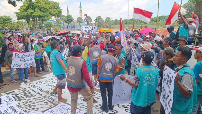 kabartuban.com – Ratusan pengemudi becak yang biasa mangkal di Terminal Kebonsari, Kabupaten Tuban, Geruduk Kantor Pemerintah Kabupaten (Pemkab) Tuban, Rabu (4/2/2026). Mereka menuntut pemerintah daerah menertibkan operasional shuttle atau bus mini pengangkut peziarah yang dinilai merugikan penghidupan warga.