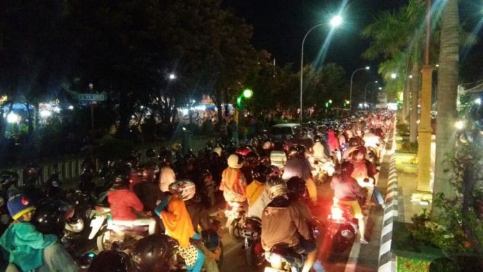 kabartuban.com – Jalur lalulintas dikawasan Alun-alun Tuban, padat dipenuhi warga yang akan merayakan malam pergantian tahun baru 2018. Akibatnya kendaraan yang melintas di kawasan tersebut terpaksa berjalan merambat, Minggu (31/12/2017).