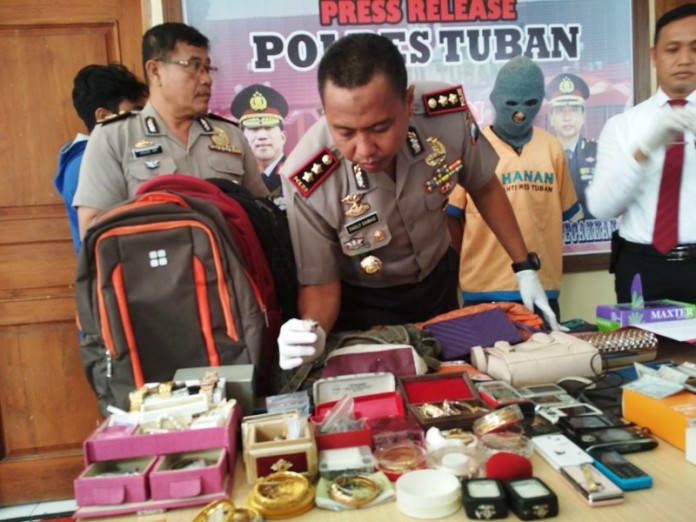 “Sebagian barang hasil curian telah dijual oleh pelaku. Untuk sementara sudah ada tiga korban yang lapor,” terang Kapolres Tuban.