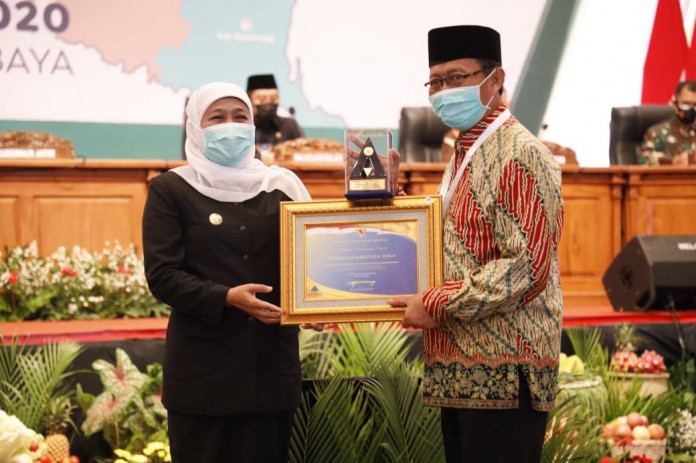 Gubernur Jawa Timur, Dra. Hj. Khofifah Indar Parawansa, M.Si didampingi Wakil Gubernur Emil Elestianto Dardak menyerahkan penghargaan ini kepada Bupati Tuban H. Fathul Huda pada acara Rapat Koordinasi Ketertiban Dan Keamanan Di Wilayah Provinsi Jawa Timur di Convention Hall Grand City, Surabaya, Senin (19/10/20) lalu. Hadir pada kesempatan ini Kapolres Tuban, AKBP Ruruh Wicaksono, S.I.K., S.H., M.H. dan Komandan Kodim 0811 Tuban, Letnan Kolonel Inf. Viliala Romadhon, S.E., MI. Pol. Beserta Kepala OPD terkait.