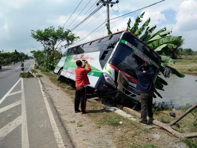 “Dia ngeblong mas, sampai mendesak bus saya, karena banyak penumpang yang saya bawa, saya berusaha menghindar tapi terlalu sempit sampai turun ke sawah,” terang Amung.