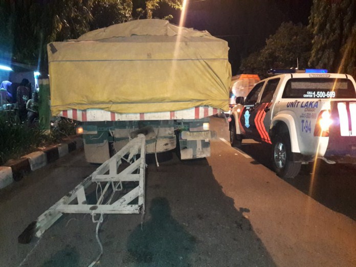 Kendaraan tersebut mengalami kelebihan muatan saat berjalan dari arah barat. Pada saat sampai dilokasi kejadian, tiba-tiba ekor gandengan truk itu terputus, dikarenakan kelebihan muatan.