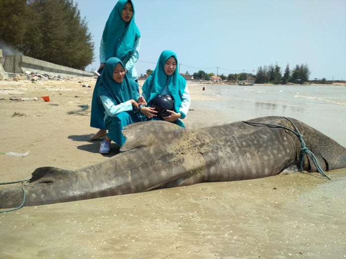 Kini bangkai ikan hiu tutul menjadi tontotan warga yang berada di sekitar pantai. Bahkan anak sekolah yang berada di daerah setempat berbondong-bondong menuju ke pantai untuk melihat ikan yang diperkirakan panjangnya sekitar 3 meter ini.